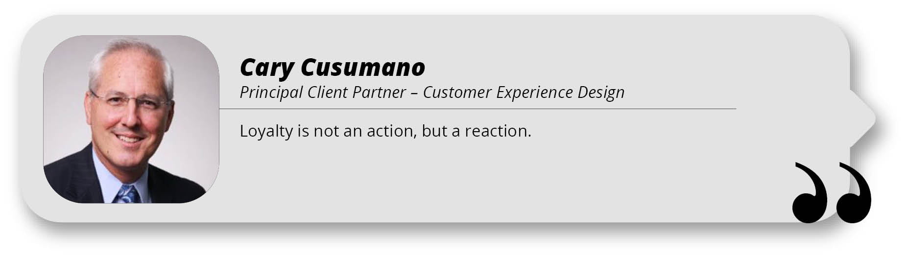 “Loyalty is not an action, but a reaction,” says Cary Cusumano, Principal Client Partner – Customer Experience Design at a leading telecommunications firm. “It’s an emotional bond to a person or organization that develops over time in response to actions that demonstrate that person is genuinely empathetic, sincere, and trustworthy. To put it simply, loyalty is a reaction to loyalty.”