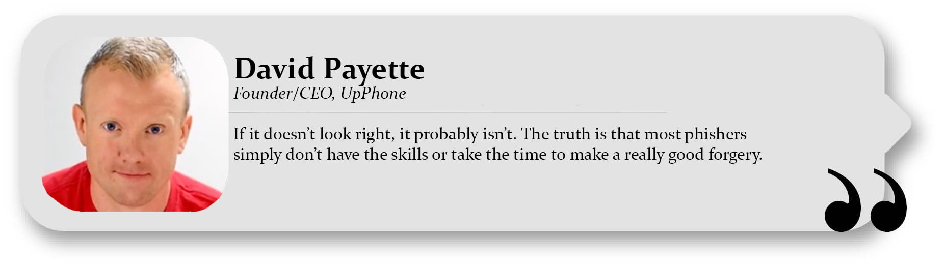 “If it doesn’t look right, it probably isn’t,” says David Payette, founder, and CEO of UpPhone. Inconsistent font size, poor grammar, and logos that appear off are often hints that something is amiss. “The truth is that most phishers simply don’t have the skills or take the time to make a really good forgery,” Payette continues. “The ‘trust your gut’ strategy isn’t foolproof…but it could make all the difference when it comes to keeping your confidential information safe.”