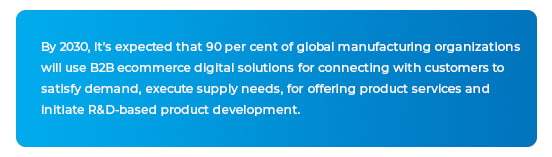 Rise in global retail eCommerce and the successful B2C model has led B2B large enterprises and SMBs to replicate it on the B2B eCommerce digital platforms. The aim is to primarily bring the superior tech-driven shopping experience of retail eCommerce to B2B eCommerce and using collaborative software to interface with customers. By 2030, it’s expected that 90 percent of global manufacturing organizations will use B2B eCommerce digital solutions. This will aid them to connect with customers to satisfy demand, execute supply needs, for offering product services and initiate R&D-based product development.