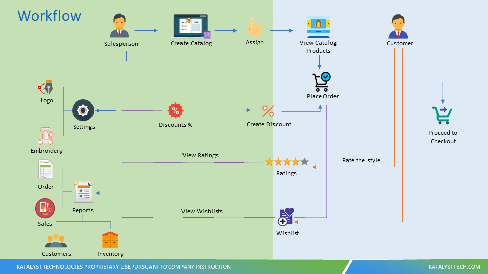 So what can microsites be used for? They provide personalized services to the B2B customer’s members during special events, distributing employee uniforms/supplies, school uniform/supplies, and much more. For example, a golf apparel brand could develop a microsite strategy that can provide complete personalization options to their golf club customers for golf events. The members of the golf club can purchase apparel from the club’s personalized website. Katalyst has created multiple microsites that have enhanced the customer’s experience significantly. Below is an example of how a Microsite connected to an e-commerce portal and ERP such as ApparelMagic.